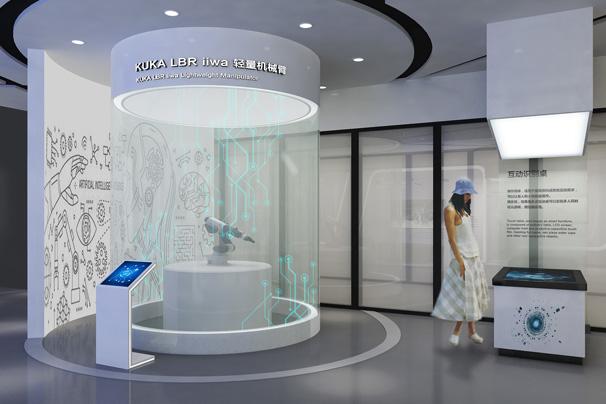 “企業(yè)數(shù)字化”、“騰飛未來”等板塊,展廳主要通過搭建多個場景還原訊飛產(chǎn)品在現(xiàn)代生產(chǎn)生活中的應用,同時通過互動觸摸屏、物體識別桌、機械臂、VR等創(chuàng)意性展項,將訊飛企業(yè)理念、產(chǎn)品核心賣點與展項及場景相融合,智能化的展項與科技風的空間風格既凸顯了科大訊飛企業(yè)智能化的特點,同時也助力展示企業(yè)的核心優(yōu)勢與價值理念。